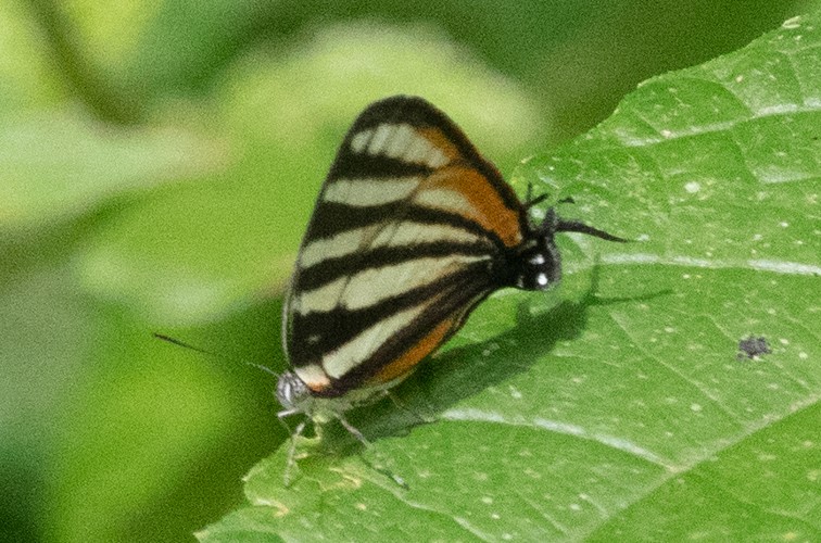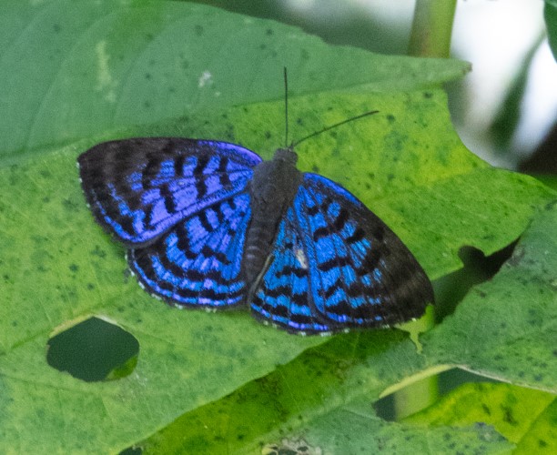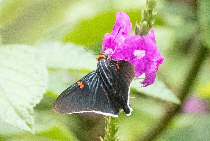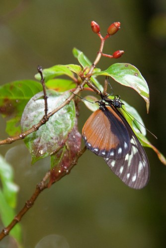 Lycaenidae include Blues, Coppers and Hairstreaks. These tend to be small (around a centimeter), brightly colored, and adorned with eyespots and small tails. If you are looking at a small butterfly and having difficulty determining which end is the head, it is a hairstreak. The butterfly will increase the illusion that the tail is actually the head by slowly rubbing together its lower wings, making the tails move like antennae. This tricks predators into attacking the wrong end. Blues and coppers tend to have iridescent scales and fringe-like margins to the wings. Around three-quarters of Lycaenid caterpillars have associations with ants, who protect them in return for honeydew received from the caterpillar. In later instars, the caterpillar my turn on the ants and eat the ant larvae. Some of their caterpillars also eat aphids and scale insects. The Lycaenids have a wide array of host plants; about half prefer legumes, so legumes you plant to attract other butterflies will often serve as host plants. Typical Costa Rican plants that serve as hosts include succulents like Stonecrop (Crassulaceae), Macadamia and Palo de Papa (Proteaceae), Malay Apple and Guayaba (Myrtaceae), Lengua de Gato and Glory Bush (Melastomatacea), Tropical Almond (Combretacea), Wild Cashew, Cashew and Mango (Anacardiaceae), Rambutan (Sapindaceae), Coral Vine (Polygonacaea), Oaks (Fagaceae) and the epiphyte Satyria meiantha (Ericaceae). These plants are mostly trees that are hopefully growing in the meadow near your butterfly garden.