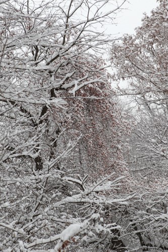 Winter scene from Kleinstuck Preserve in Kalamazoo Michigan. Note how ice coating multiple crabapple fruits (center back) weigh down the branches compared to the trees with bare branches (all of photo periphery).
