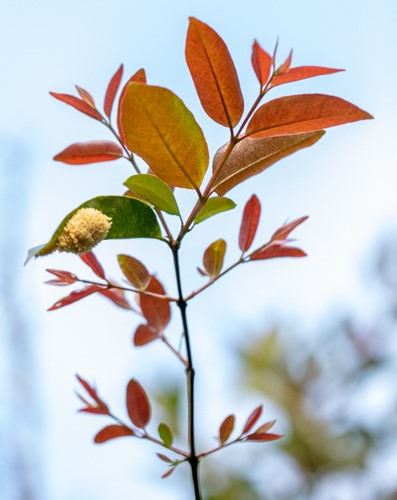 Red leaves newly unfurled on Cas plant, Nuevo Arenal. Note that the one fully green leaf already is burdened by the egg case of a Lantern Fly, the so-called Peanut-headed bug.