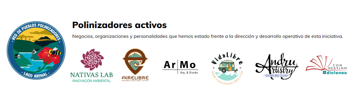 Antes de finalizar, es necesario presentar al equipo que coordina la Red y organiza este Festival desde sus respectivas iniciativas comerciales: María de los Ángeles Mora, de Nativas Lab, bióloga, autora del folleto ?Zumbido entre jardines? y artífice de la Red; Marynés Fernández Berroeta de Airelibre Adventures & hosting, quien plantea el concepto de turismo regenerativo; Kenneth Artavia Mora de AR/MO, arquitecto y músico, fue el que diseñó el Parque Polinizador desde la acupuntura urbana; Vic Chops, especialista en planificación de proyectos sociales, feminista y co-fundadora de Vida Libre, minicasas rodantes; Andru Guerrero, ilustradora y artista, cofundadora de Arttitud, mural and design; y, Fabricio Briceño G. de Con Destino Ediciones, investigador sociocultural y editor, co-fundador de Vida Libre y diseñador de la web: redpueblospolinizadores.org. En conjunto somos un equipo interdisciplinario.