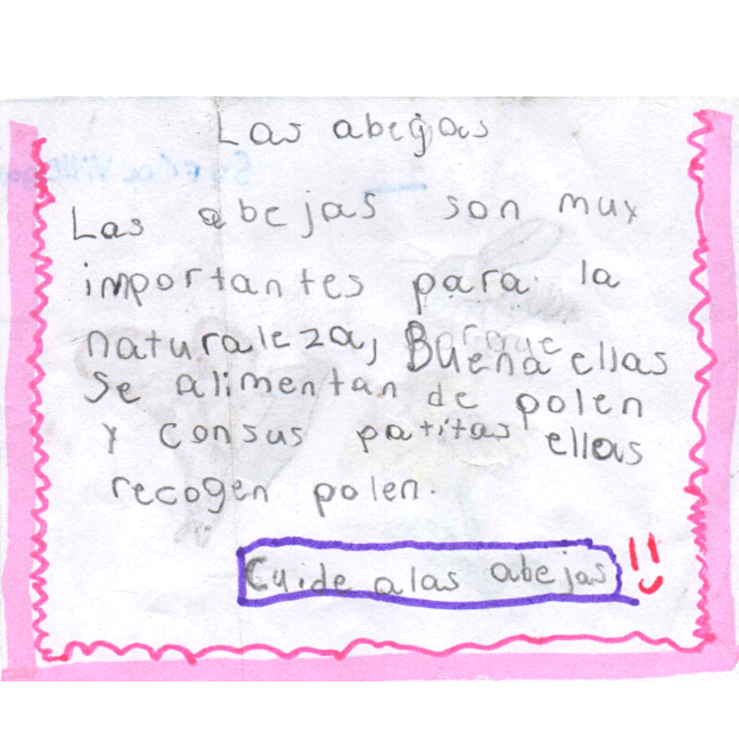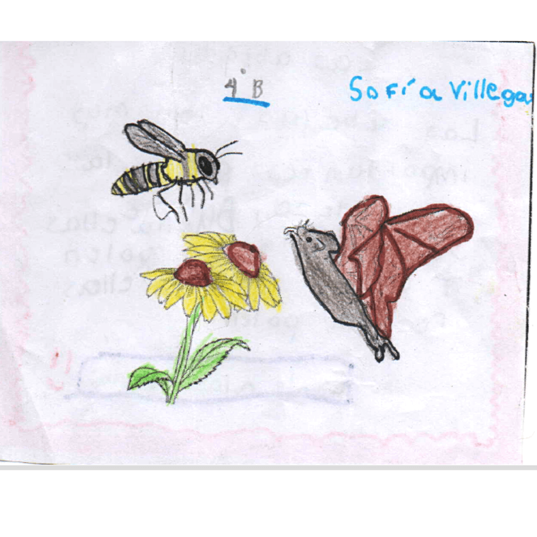 En esa ocasión compartimos una silueta de la polinización a cada estudiante para que lo colorearan y a su vez les permitiera escribir una breve historia, o mensaje, que acompañara su acercamiento a los animales polinizadores, especialmente una abeja y un murciélago. Nos interesa seguir trabajando a favor de una conciencia ecológica y quedamos alegres con el resultado.